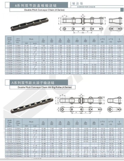 雙節(jié)距加長(zhǎng)銷軸鏈條,是直板的輸送鏈條,最小的節(jié)距是25.4毫米,一直到101.6毫米都是可以定做的,節(jié)距不同,對(duì)應(yīng)的參數(shù)是不同的,我們可以舉例說(shuō)明,C2042型的加長(zhǎng)銷鏈條,節(jié)距是25.4毫米,滾子直徑是15.88毫米,內(nèi)節(jié)內(nèi)寬是7.85毫米,銷軸直徑是3.96毫米,銷軸長(zhǎng)度是16.6毫米,內(nèi)鏈板高度是12毫米,鏈板厚度是1.5毫米。不同型號(hào),對(duì)應(yīng)不同的參數(shù),型號(hào)有C2052,C2062,C2082,C2122,C2102等,我們生產(chǎn)質(zhì)量上乘的鏈條,買的放心,用著更放心。